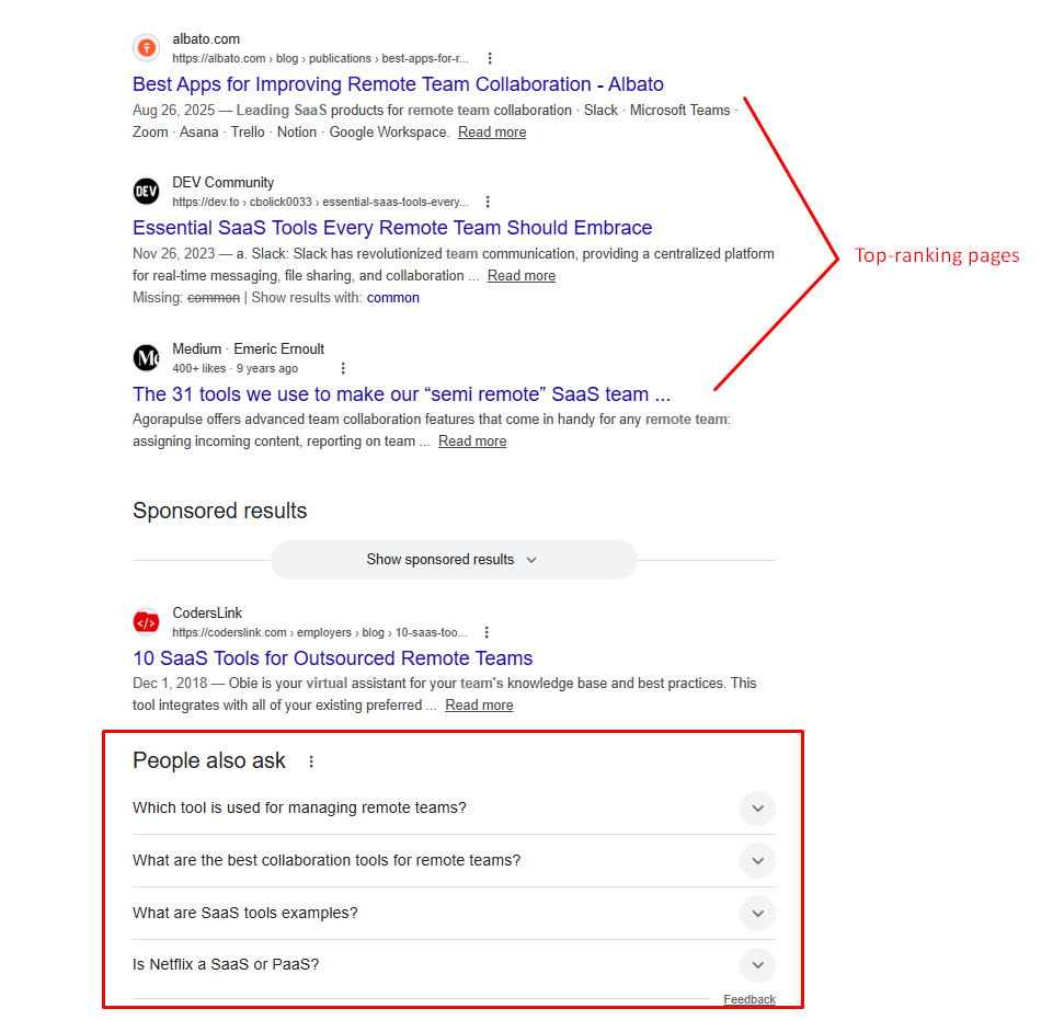 For example, if you want to target “common SaaS tools for remote teams”, the SERP looks like this: